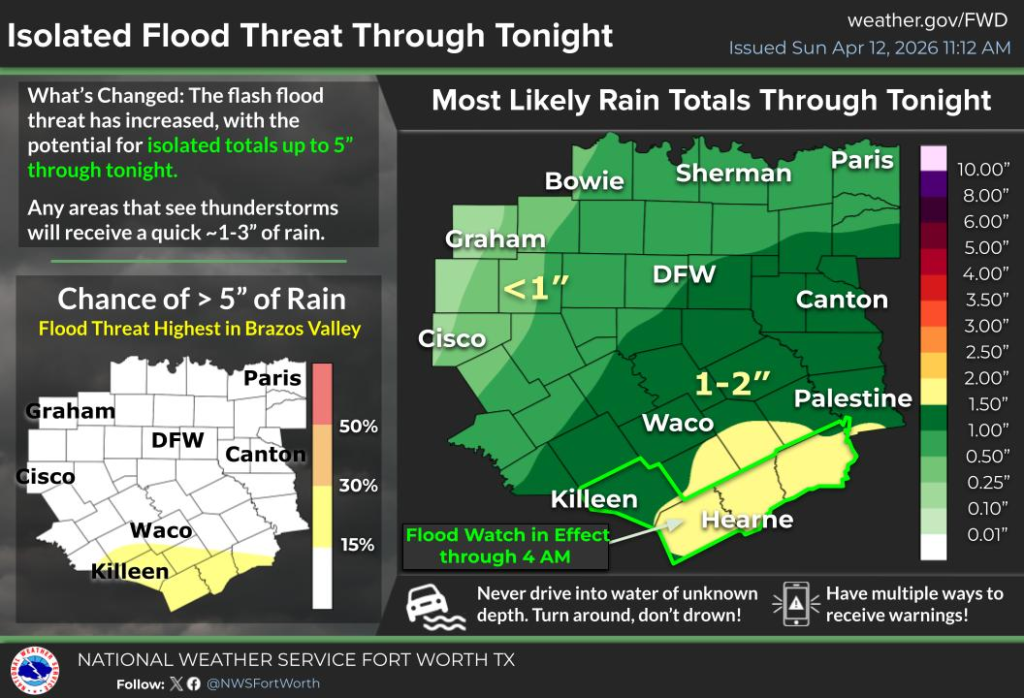 Forecasters in the Fort Worth/Dallas region report that the flash flood threat has intensified across portions of Central Texas and the Brazos Valley. While not all areas are expected to see rainfall, locations that do experience thunderstorms could receive quick rainfall totals of 1 to 3 inches.