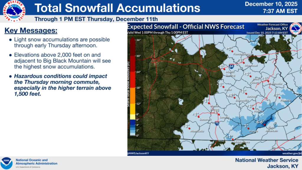 Motorists across the region are urged to slow down, allow extra travel time, and monitor changing road conditions. Kentucky highway updates are available at goky.ky.gov, and officials stress using caution during both the evening hours and Thursday morning’s commute. The combination of colder temperatures, wet roads, and light accumulation could create hazardous travel even where snowfall totals remain modest.
