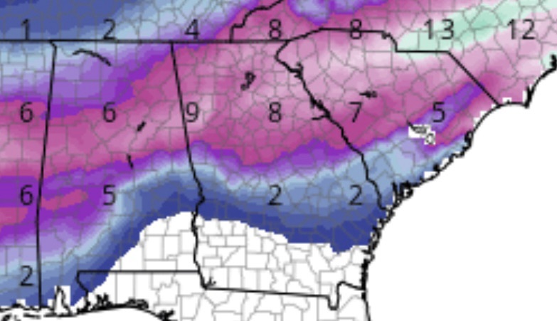 Currently, the GFS is showing several inches of snow possible for northern and central Georgia with the northern part of the state receiving the most with up to 9 or 10 inches in some places.