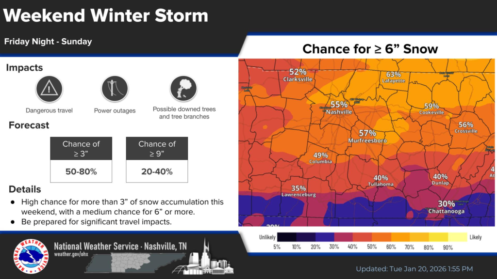 According to the National Weather Service in Nashville, there is increasing confidence in at least several inches of snow for much of Middle Tennessee, with the probability of measurable snowfall (3 inches or more) forecast to be moderate, and appreciable snow accumulations possible if the storm’s track and precipitation type favor cold conditions.