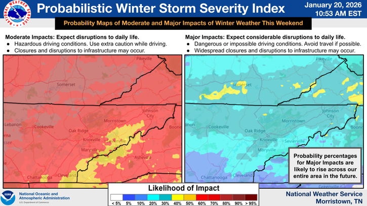 - East Tennessee: Winter weather may impact East Tennessee as well, with forecasts indicating that heavy frozen precipitation — including snow — is increasingly likely, though where snow transitions to ice remains a forecast challenge.