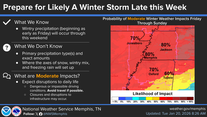 - West Tennessee (including Memphis area): Models suggest snow may start Friday night and continue intermittently through the weekend, with accumulating snow likely if cold air remains entrenched.