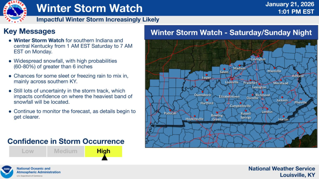 The Winter Storm Watch includes portions of south central and southeastern Indiana, closely tied into the broader watch area that extends into central Kentucky and eastern Illinois. Specific zones under the watch encompass counties from near the Ohio River northward toward the Interstate-70 corridor, with the exact list maintained on the NWS website.