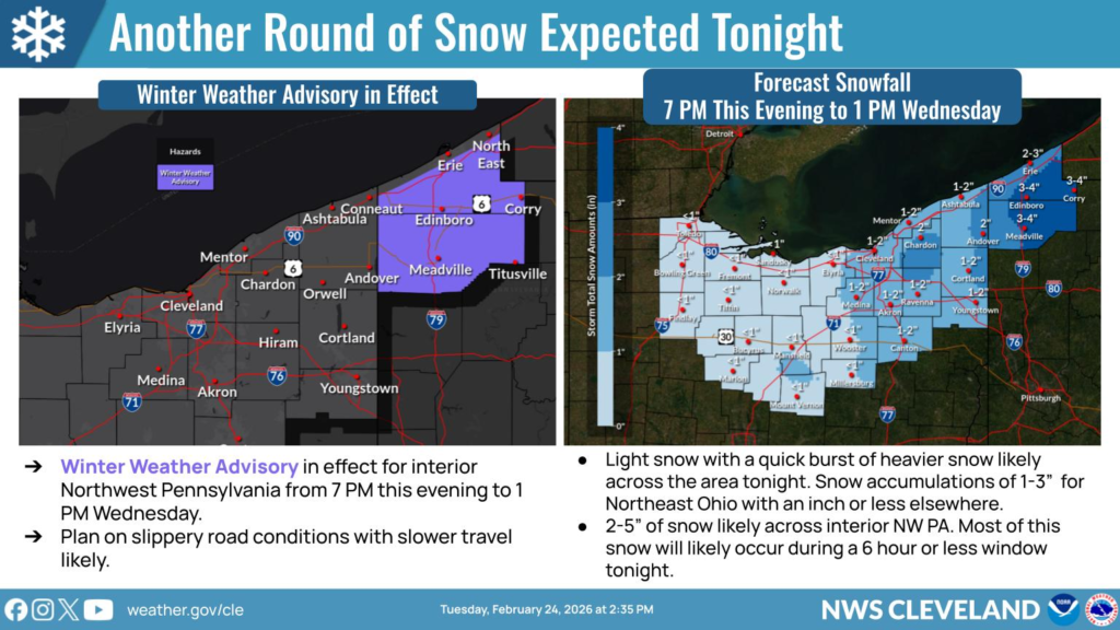 A Winter Weather Advisory remains in effect for portions of northwest Pennsylvania, where 2 to 5 inches of snow are possible. Although the heaviest snow is expected outside of Ohio, drivers across the state should still prepare for reduced visibility and slick road conditions at times tonight and into early Wednesday.