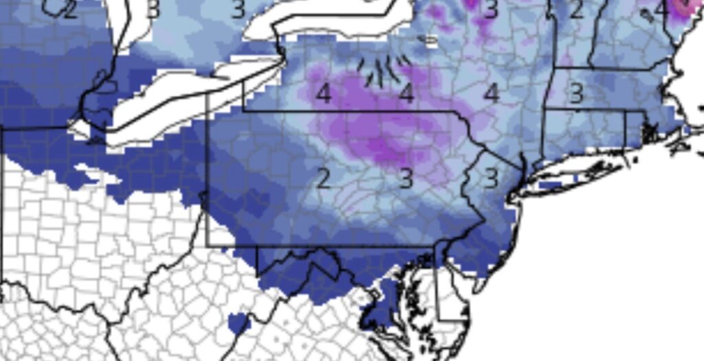 The current run of the GFS model shows most of Pennsylvania receiving anywhere from 1 to 4 inches of snow by Christmas Day on Thursday.