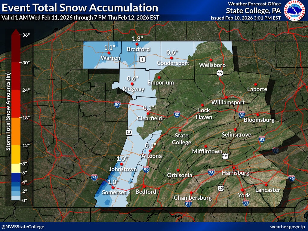 According to the National Weather Service, periods of light freezing rain are forecast from 6 p.m. to midnight Tuesday, with a light glaze of ice possible. The advisory includes the cities of Pottsville, Berwick, Bloomsburg, Laporte, and Lebanon.