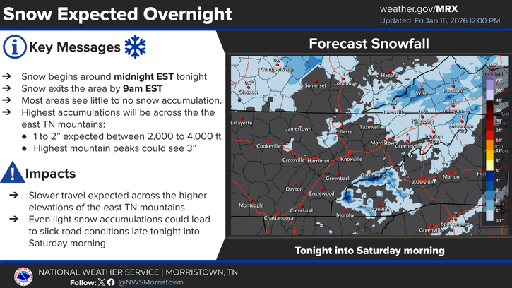 While widespread impacts are not expected, officials warned that travel could be slower across the higher elevations of the east Tennessee mountains. Even light snow accumulations could lead to slick road conditions late Friday night into early Saturday morning, especially on untreated roads.
