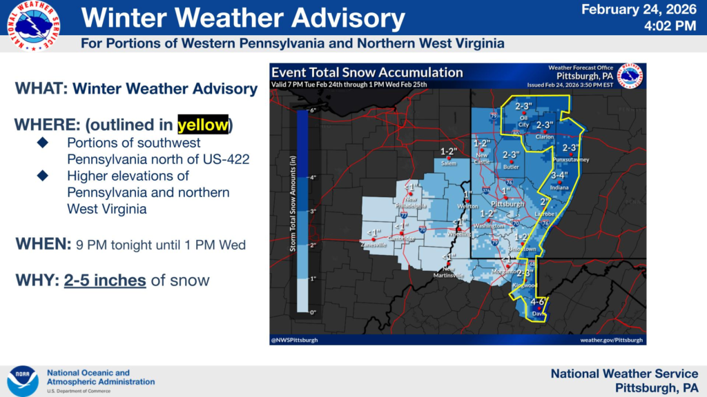The National Weather Service Pittsburgh has issued a new Winter Weather Advisory for areas northeast of Pittsburgh and along the higher ridges. The advisory calls for 2 to 5 inches of new snow, with locally higher amounts possible across the highest elevations.