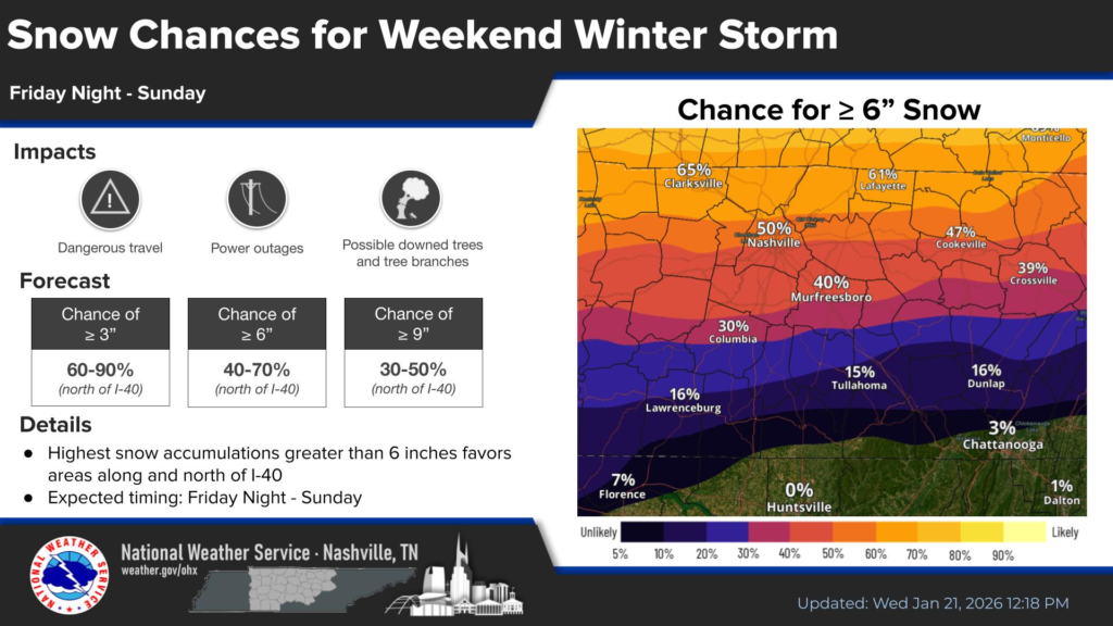 - Areas north of Interstate 40, including much of Middle and West Tennessee, have the highest probability of at least 6 inches of snow, with localized amounts potentially higher depending on exact storm track and elevation.