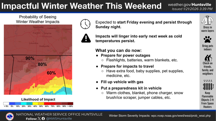 ALABAMA — The National Weather Service has issued a Winter Storm Watch for northern and much of central Alabama, in effect from Friday evening through Sunday afternoon, as a significant winter weather system approaches the region. The watch covers areas generally north of Interstate-20, including Huntsville, Gadsden, Oneonta, Jasper and other communities across the northern third of the state.