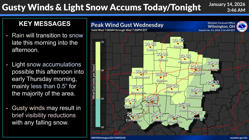 OHIO — Winter weather returns across much of Ohio beginning Wednesday, with rain changing to snow and gusty winds potentially affecting travel conditions through early Thursday, according to the National Weather Service Wilmington Ohio and National Weather Service Cleveland.