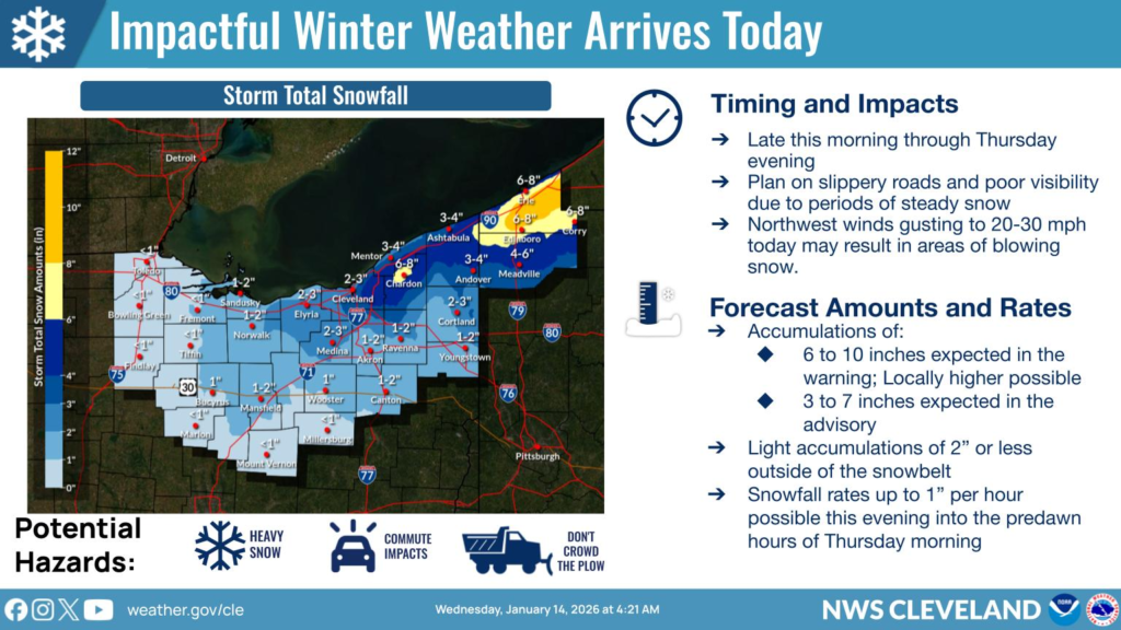 According to NWS-Cleveland projections, some snowbelt locations may receive 6 to 10 inches of snow where lake-effect snow persists, while surrounding areas could pick up 3 to 7 inches through Thursday. Snowfall rates up to an inch per hour are possible overnight into the predawn hours Thursday, the forecast shows.