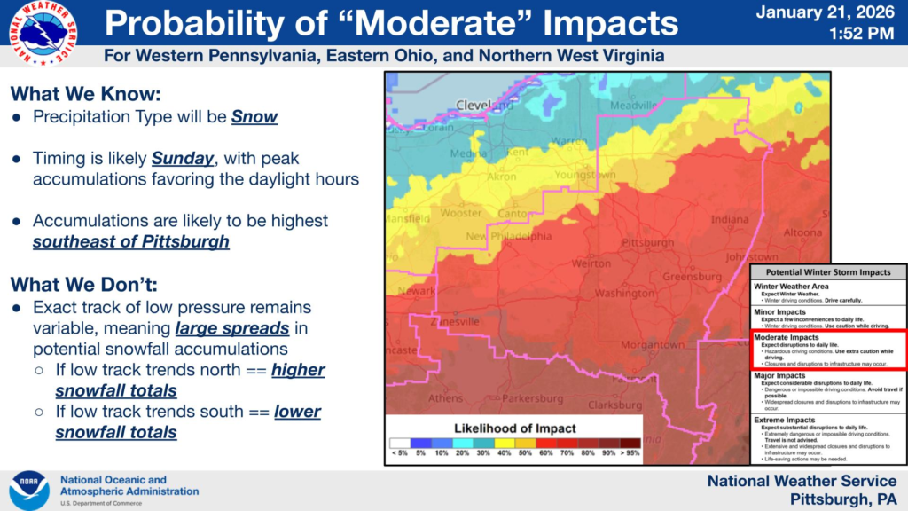 Forecast guidance indicates that Sunday will likely be the main day for snowfall, with peak accumulations favored during daylight hours. While snow is expected across a broader region, the highest impacts are most likely to occur in counties southeast of Pittsburgh, where the probability of moderate winter storm impacts is highest.