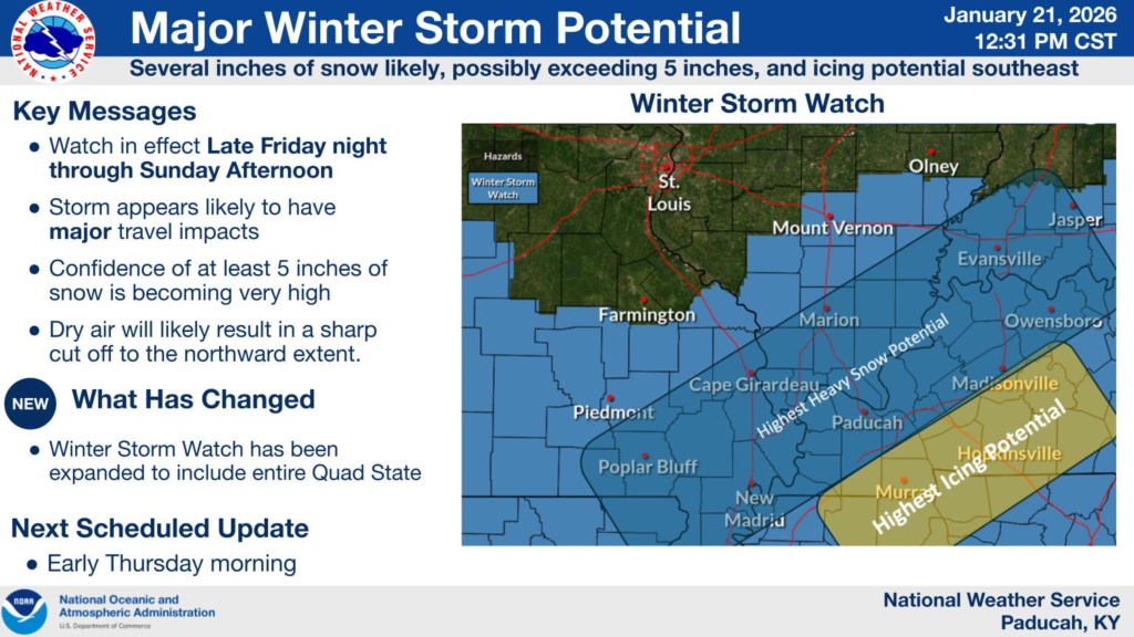 ILLINOIS — A Winter Storm Watch is in effect for a large portion of southern Illinois as a significant winter weather system is expected to impact the region from late Friday night through Sunday morning. The watch, issued by the National Weather Service Paducah Forecast Office, covers counties roughly south of Interstate-70 and includes communities such as Cairo, Golconda, Metropolis, and surrounding areas.