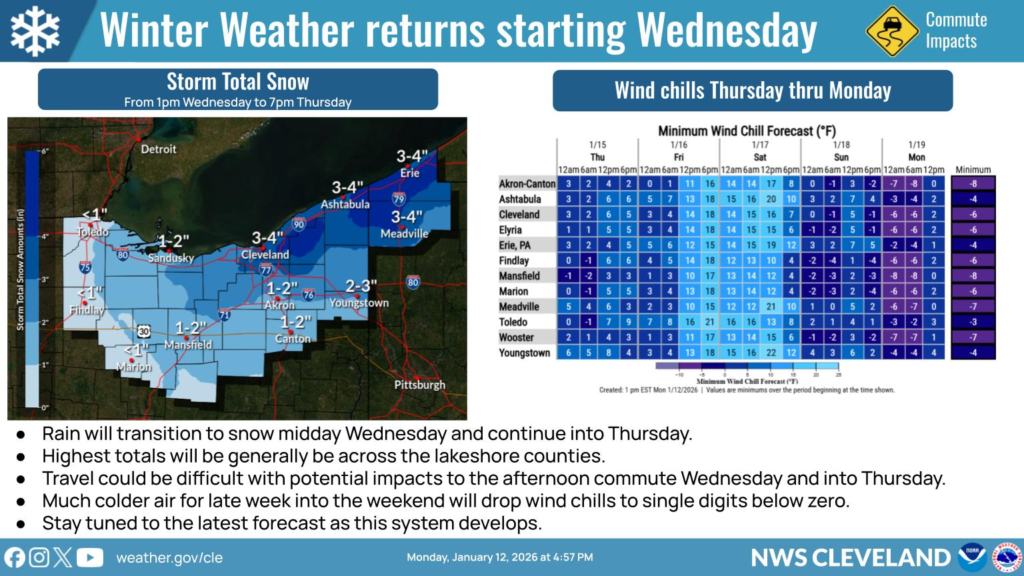 Forecasters say rain will move into the region late Tuesday night into early Wednesday. As colder air moves in, the rain is expected to transition to snow around midday Wednesday. Snowfall totals are expected to range from about 1 to 4 inches, with the highest amounts generally near the Lake Erie shoreline and lower totals farther inland.
