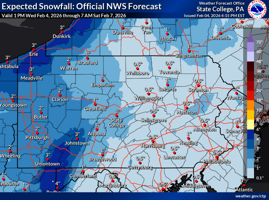 In Cambria and Somerset counties, including the cities of Johnstown and Somerset, forecasters say snow accumulations of 2 to 4 inches are possible, with locally higher amounts up to 6 inches on higher terrain and ridgetops. Winds in these areas could gust as high as 50 mph, which may lead to blowing and drifting snow and sharply reduced visibility. The heaviest snowfall is expected Friday afternoon through Friday night.