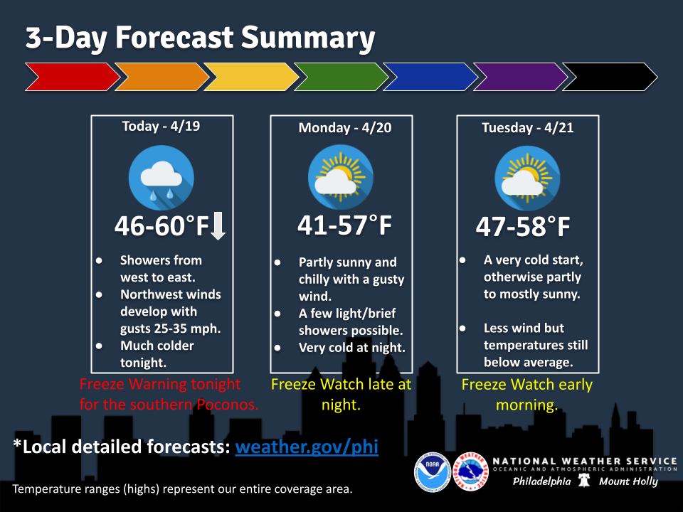According to the National Weather Service in Mount Holly, Sussex County is under a freeze warning from 11 p.m. Sunday through 10 a.m. Monday. Temperatures are expected to drop to around 31 degrees overnight. A freeze watch is also in place from late Monday night into Tuesday morning, when temperatures could fall as low as 21 degrees.