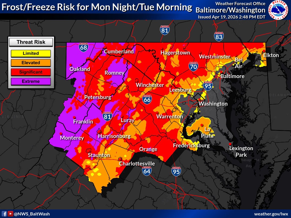 Additional portions of western and southwest Virginia — including Roanoke, Montgomery, Pulaski, Bedford, Amherst and Pittsylvania counties — are also included in the freeze watch, with similar cold conditions expected.