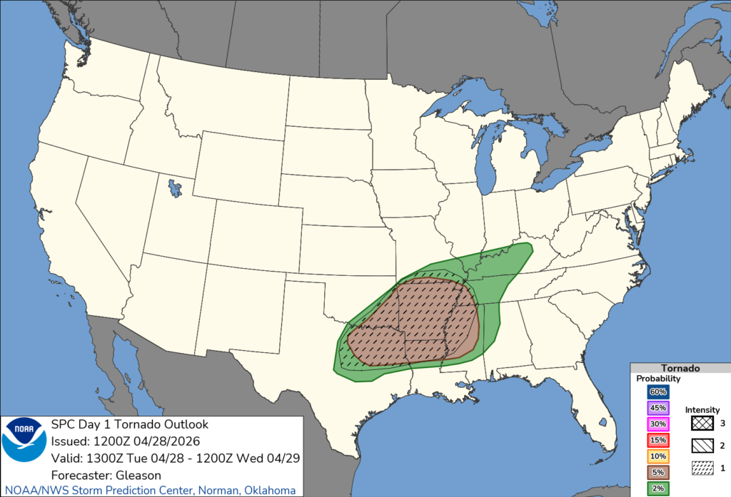 The greatest tornado risk is expected to develop during the afternoon and evening hours as storms intensify in a highly unstable atmosphere. Forecasters say multiple supercell thunderstorms could form, increasing the potential for isolated tornadoes.