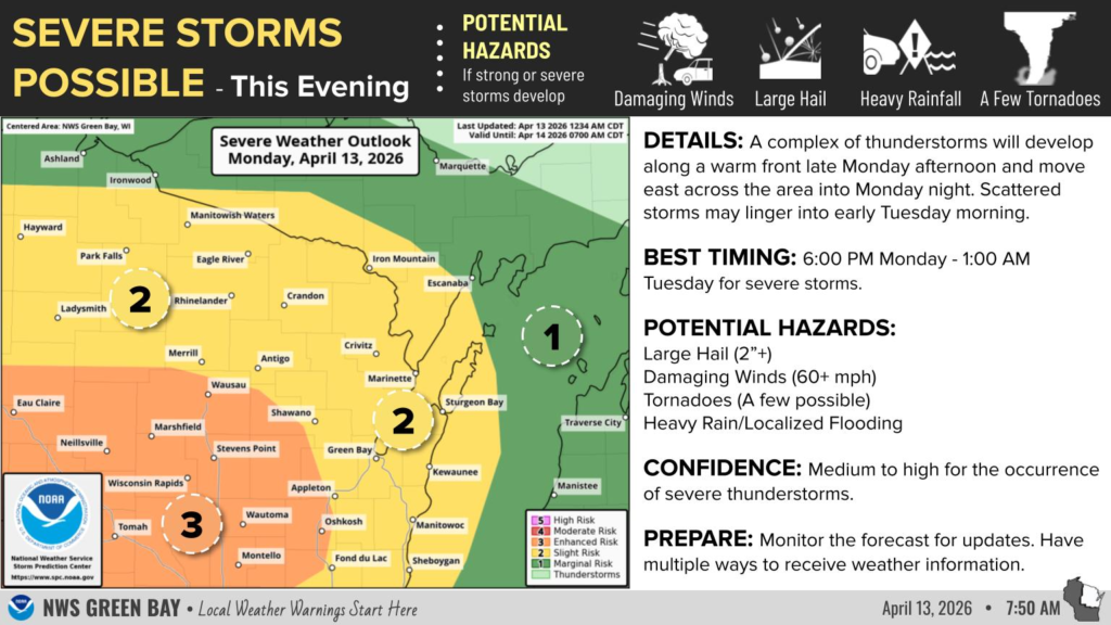 WISCONSIN — Severe storms and ongoing flooding concerns are expected across parts of Wisconsin on Monday, according to the National Weather Service in Green Bay.