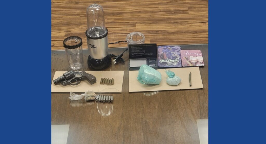 Police said officers found 7.59 ounces of a substance believed to contain heroin and fentanyl inside a Louis Vuitton bag that also held Franklin’s mail and personal items. A .38-caliber revolver loaded with hollow-point ammunition was found nearby, with additional bullets hidden in the basement ceiling.