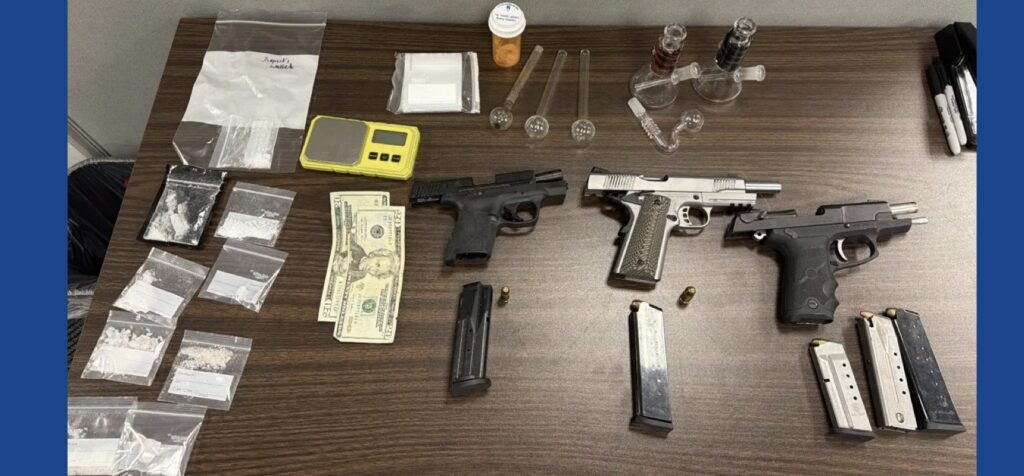 During the search, authorities said they seized methamphetamine and drug paraphernalia. Police also reported finding three handguns inside the home, along with items including glass pipes, a digital scale and ammunition.