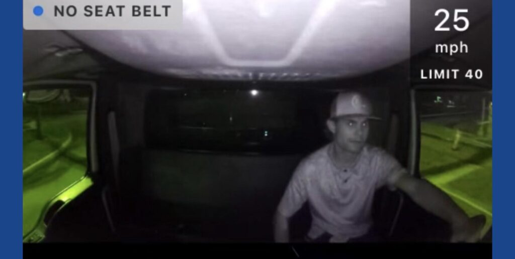 The images show the individual behind the wheel of the dump truck, reportedly driving 25 miles per hour in a 40 mph zone and not wearing a seat belt.