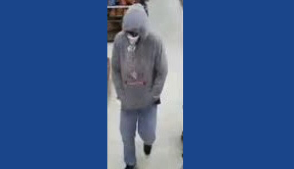 The suspect is described as a white male, about 5 feet 7 inches to 5 feet 8 inches tall, with blonde curly hair, which may have been a wig. He was last seen wearing a gray hoodie, blue jeans, blue Nike sneakers, and a white and gray face covering.