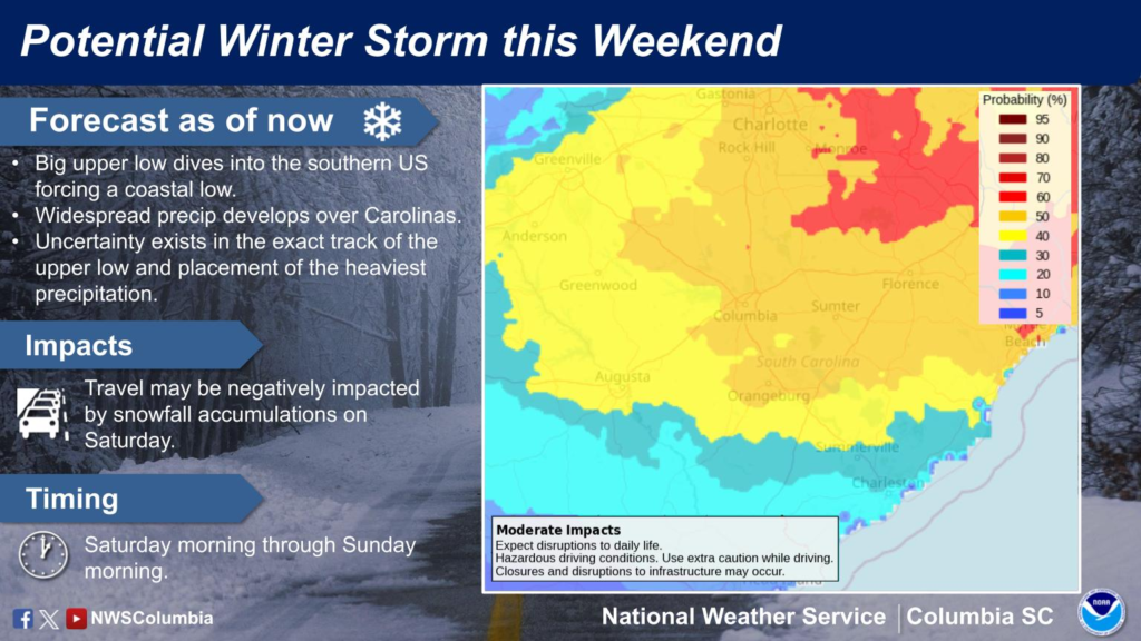 SOUTH CAROLINA — Forecasters are closely monitoring the potential for a winter storm to affect South Carolina this weekend, with snow identified as the primary threat across much of the state.