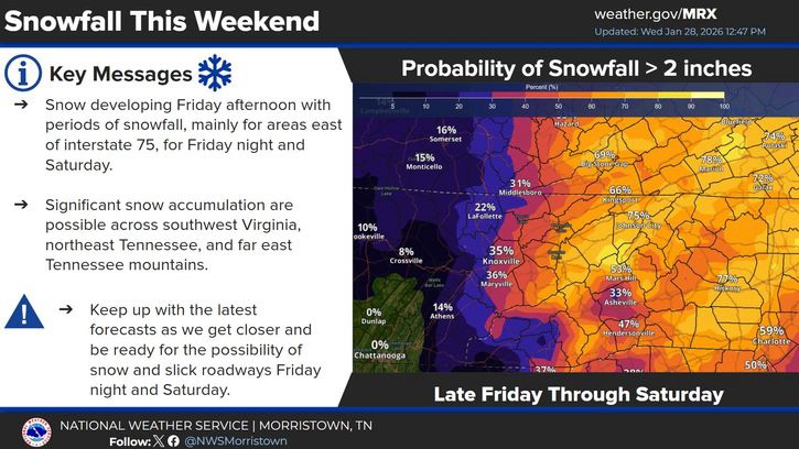 According to the National Weather Service, snow is expected to develop beginning Friday afternoon or evening and continue through Saturday, with the greatest potential for accumulating snow in higher elevations and areas closer to the Virginia border. The system is expected to affect parts of northeast Tennessee, including mountain communities, where colder temperatures will support snow reaching the ground.