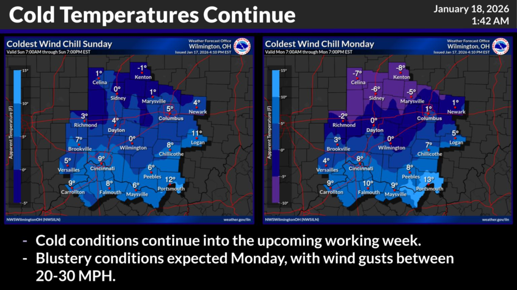 The coldest conditions are expected Monday night into Tuesday, when wind chill values could range from minus 10 to minus 20 degrees, particularly in northern and central Ohio. Weather graphics from the National Weather Service indicate subzero wind chills in many communities, including portions of western, central and northern Ohio, with only limited improvement during daylight hours.