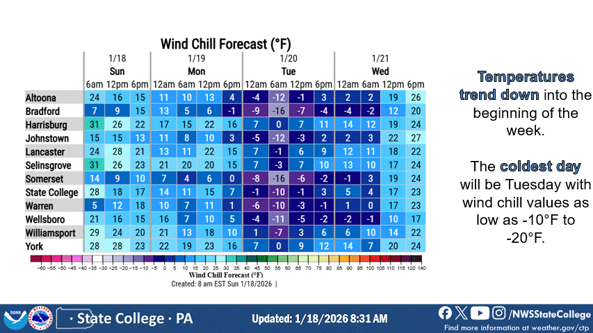 According to the National Weather Service State College PA, Cold Weather Advisories will be in effect from Monday night through late Tuesday morning or early afternoon for a wide swath of the state. Wind chills are forecast to plunge as low as 18 to 20 degrees below zero in some areas, creating dangerous conditions for students waiting at bus stops or walking to school.
