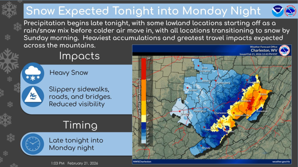 Charleston, South Charleston, Hurricane, Ripley, Spencer, Clarksburg and surrounding communities are forecast to receive 3 to 5 inches of snow. While totals may be slightly lower than mountain areas, slick roads and reduced visibility are still expected to significantly impact travel.