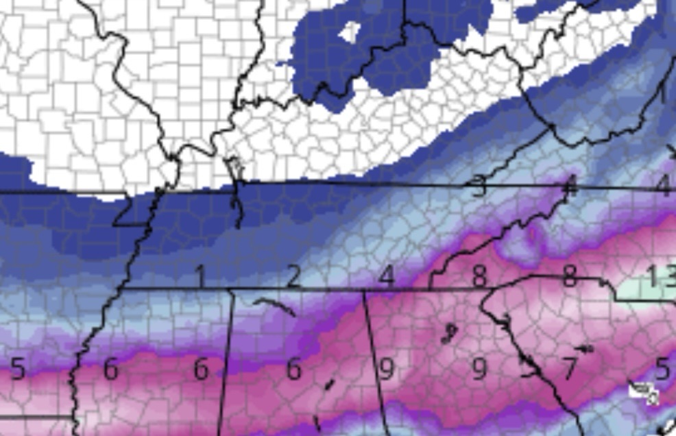 When it comes to snow totals, the GFS is showing a more southern track which means less snow for the bulk of Tennessee.