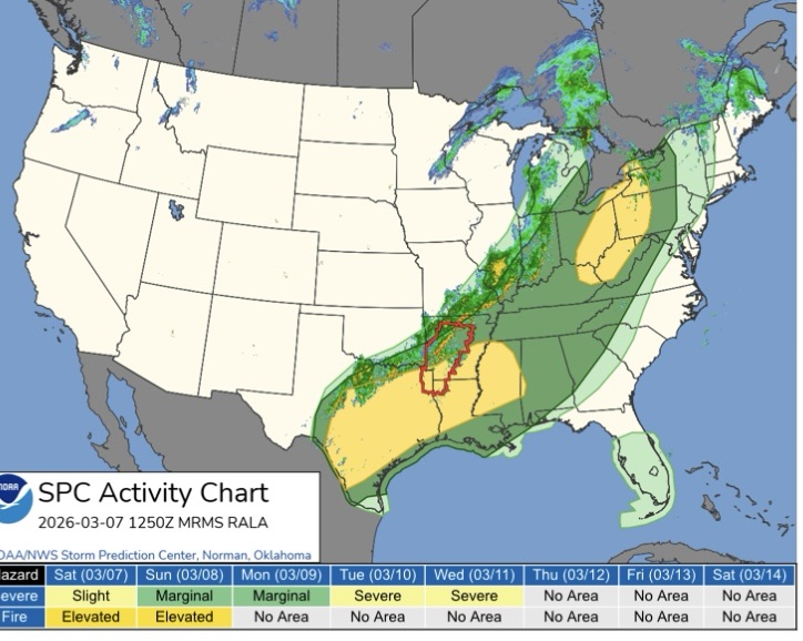 According to the National Weather Service’s Storm Prediction Center, portions of Texas are included in a severe weather outlook for Saturday as a strong storm system moves across the southern Plains and into the lower Mississippi Valley.