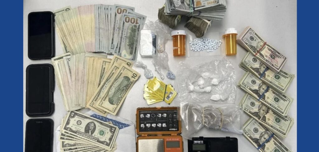 During the search, detectives recovered multiple items consistent with drug distribution. Police said they found 14.71 grams of suspected cocaine, 50.55 grams of suspected pressed fentanyl pills, nine suspected Suboxone strips, 35 grams of suspected psilocybin mushrooms and 9 grams of suspected alprazolam — approximately 29 pills.