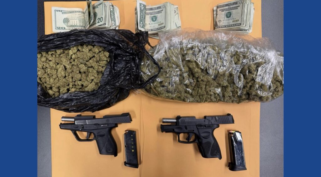 A subsequent search of the vehicle uncovered approximately 386 grams of suspected marijuana, nearly $1,200 in cash, and two firearms.