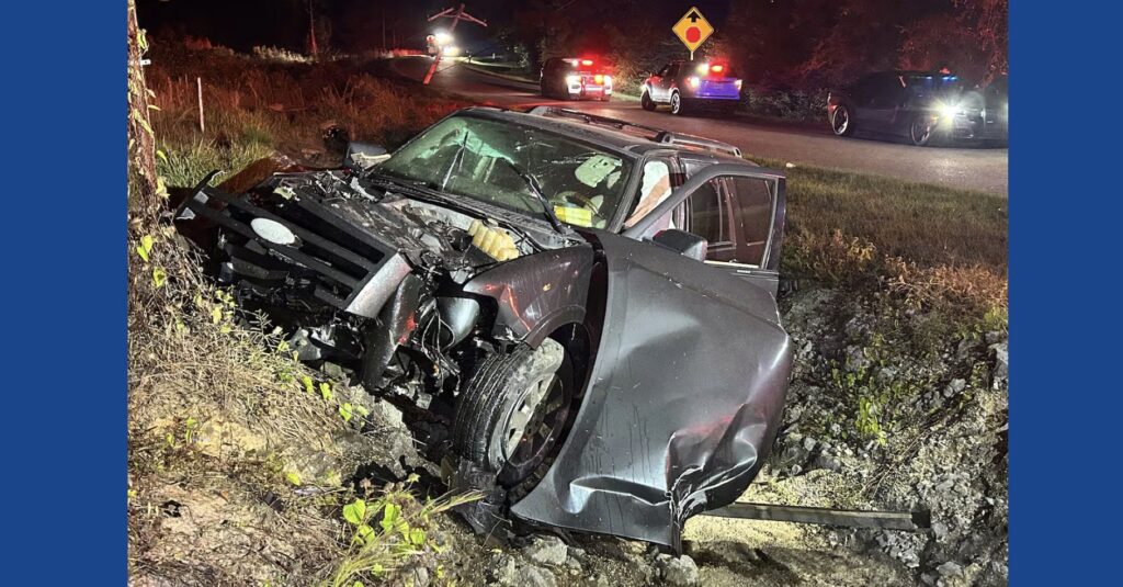 The crash happened around 2:30 a.m. when a Ford Expedition went off the road and struck a three-phase Dixie Electric Power Association pole, snapping it before coming to rest in a nearby ditch.